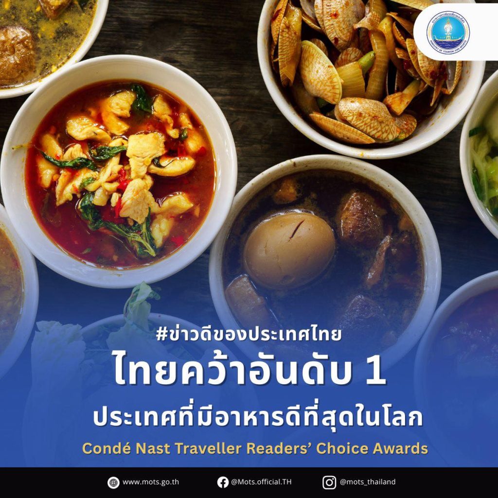 จากผลโหวตผู้อ่านสื่อท่องเที่ยวชื่อดัง (Condé Nast Traveller) ประเทศไทย ได้รับคะแนนสูงถึง 98.33 และคว้าแชมป์ในหมวดประเทศที่มีอาหารดีที่สุดในโลก