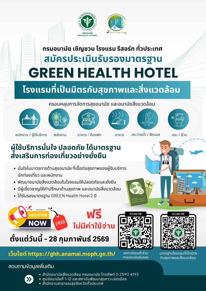 กรมอนามัย เชิญชวนโรงแรม รีสอร์ท ทั่วประเทศ ร่วมสมัครประเมินรับรองมาตรฐาน “Green Health Hotel” (โรงแรมที่เป็นมิตรกับสุขภาพและสิ่งแวดล้อม) ฟรี