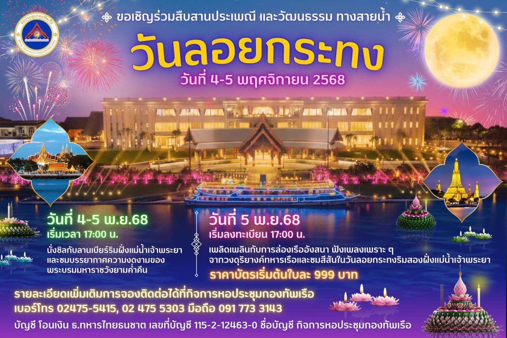 กองทัพเรือ ชวนลอยกระทงริมแม่น้ำเจ้าพระยา ในวันที่ 4 – 5 พฤศจิกายน 2568