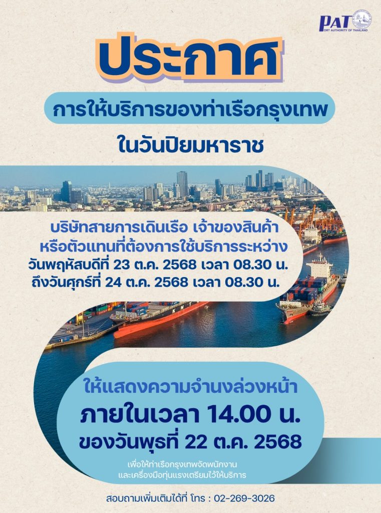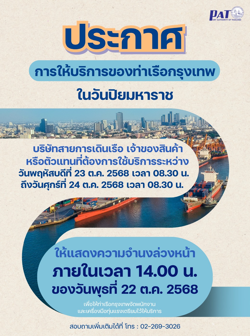 การท่าเรือแห่งประเทศไทย แจ้งประกาศการให้บริการของท่าเรือกรุงเทพ ในวันปิยมหาราช