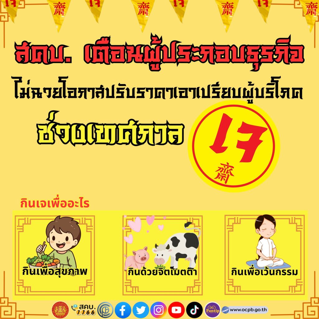 สำนักงานคณะกรรมการคุ้มครองผู้บริโภค เตือนผู้ประกอบธุรกิจ ไม่ฉวยโอกาสปรับราคาเอาเปรียบผู้บริโภค ช่วงเทศกาลกินเจ