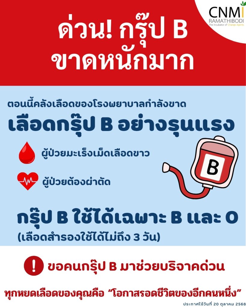 คณะแพทยศาสตร์โรงพยาบาลรามาธิบดี เชิญผู้มีจิตศรัทธา กรุ๊ป B บริจาคเลือด เนื่องจากคลังเลือดอยู่ในภาวะวิกฤติ