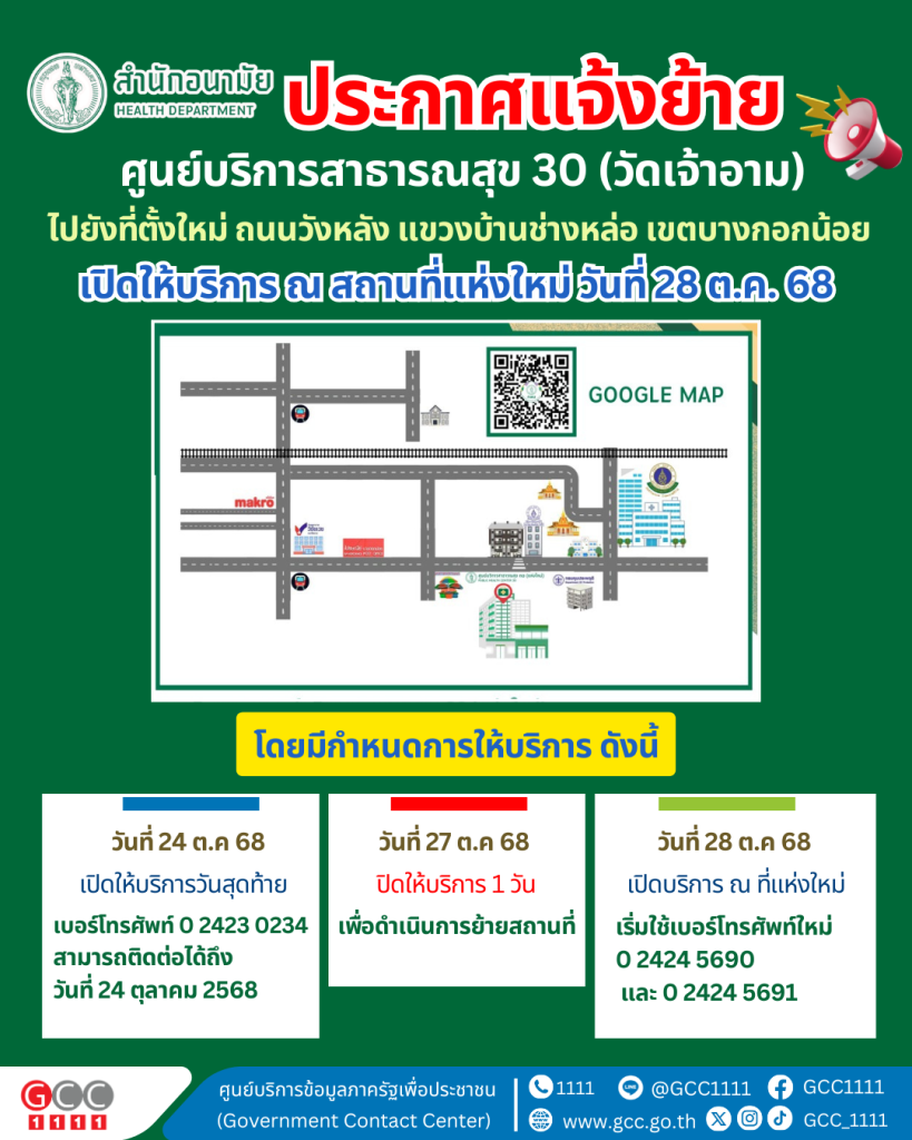 สำนักอนามัย กรุงเทพมหานคร ประกาศแจ้งย้าย ศูนย์บริการสาธารณสุข 30 (วัดเจ้าอาม) เนื่องจากได้รับงบประมาณในการก่อสร้างอาคารแห่งใหม่