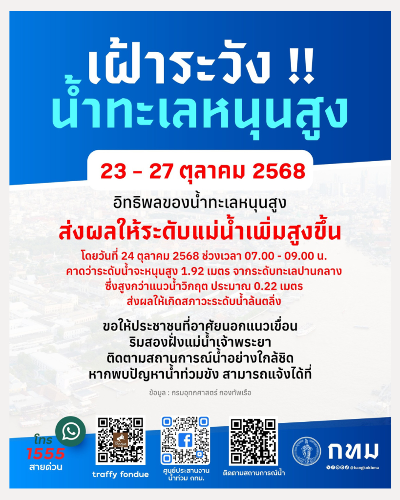 กรุงเทพมหานคร เฝ้าระวังน้ำทะเลหนุนสูง วันที่ 23 – 27 ตุลาคม 2568 โดยวันที่ 24 ตุลาคม 2568 ช่วงเวลา 07.00 – 09.00 น. คาดว่าระดับน้ำจะหนุนสูง 1.92 เมตร จากระดับทะเลปานกลาง ซึ่งสูงกว่าแนวน้ำวิกฤต ประมาณ 0.22 เมตร ส่งผลให้เกิดสภาวะระดับน้ำล้นตลิ่ง ทั้งนี้ขอให้ประชาชนที่อาศัยนอกแนวเขื่อนริมสองฝั่งแม่น้ำเจ้าพระยาติดตามสถานการณ์น้ำอย่างใกล้ชิด