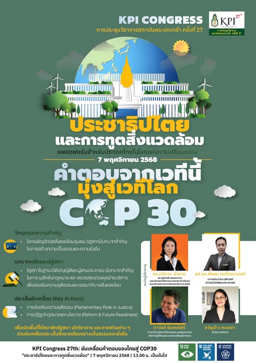 ประชาธิปไตยและการทูตสิ่งแวดล้อม คำตอบจากเวทีไทย มุ่งสู่เวทีโลก COP30 เวทีสำคัญจาก KPI Congress ครั้งที่ 27 ที่สถาบันพระปกเกล้าเปิดพื้นที่ให้รัฐสภา นักวิชาการ และภาคประชาชน ร่วมกันหาคำตอบ “บทบาทของรัฐสภาไทยในโลกแห่งการเปลี่ยนแปลงด้านสิ่งแวดล้อม” วิกฤตสิ่งแวดล้อมรุนแรงขึ้นทุกวัน รัฐสภาจึงต้องเป็นกลไกสำคัญในการสร้างความเป็นธรรมและความยั่งยืนทางสิ่งแวดล้อม