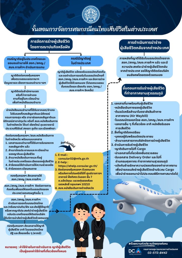 กรมการกงสุล ขอแจ้งขั้นตอนการจัดการศพกรณีคนไทยเสียชีวิตในต่างประเทศ เพื่อเป็นข้อมูลสำหรับญาติในการดำเนินการขอรับร่างผู้เสียชีวิตกลับประเทศไทยหรือจัดการศพในต่างประเทศ