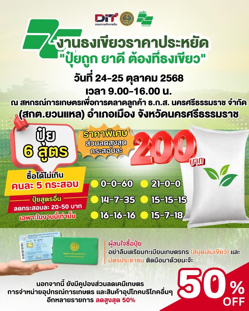กรมการค้าภายใน จัดกิจกรรม “ธงเขียวราคาประหยัด” ปุ๋ยราคาพิเศษและคูปองส่วนลด ตั้งแต่บัดนี้ – 25 ตุลาคม 2568 เวลา 09.00 – 16.00 น. ณ สหกรณ์การเกษตรเพื่อการตลาดลูกค้า ธกส. นครศรีธรรมราช อำเภอเมือง จังหวัดนครศรีธรรมราช สำหรับผู้ที่สนใจซื้อปุ๋ย เตรียมทะเบียนเกษตรกร (สมุดเล่มเขียว) และบัตรประชาชน มาให้พร้อม ปุ๋ยธงเขียว 6 สูตร ราคาพิเศษ ลดสูงสุดกระสอบละ 200 บาท ซื้อได้ไม่เกินคนละ 5 กระสอบ ปุ๋ยสูตรอื่นลดอีก 20 – 50 บาท
