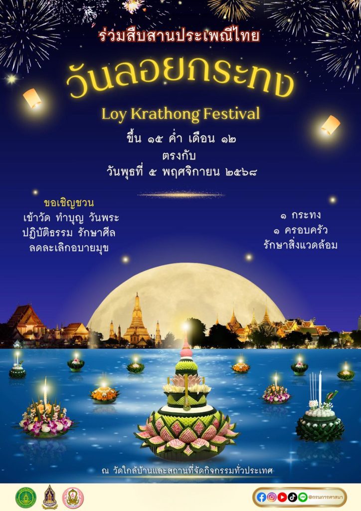 กรมการศาสนา ร่วมสืบสานประเพณีวันลอยกระทง เชิญชวนร่วมทำบุญ รักษาศีล และอนุรักษ์สิ่งแวดล้อม ข่าวสารกิจกรรม, ลอยกระทง, เทศกาล กรมการศาสนา ร่วมสืบสานประเพณีวันลอยกระทง เชิญชวนร่วมทำบุญ รักษาศีล และอนุรักษ์สิ่งแวดล้อม กรมการศาสนา เชิญชวนพุทธศาสนิกชนทั่วประเทศร่วมสืบสานประเพณีอันดีงามของไทย “วันลอยกระทง” โดยขอให้ประชาชนร่วมทำบุญ เข้าวัด ปฏิบัติธรรม รักษาศีล และละเว้นอบายมุข เพื่อความเป็นสิริมงคลแก่ตนเองและครอบครัว กรมการศาสนา เชิญชวนพุทธศาสนิกชนทั่วประเทศร่วมสืบสานประเพณีอันดีงามของไทย “วันลอยกระทง” ซึ่งตรงกับวันพุธที่ 5 พฤศจิกายน 2568 (ขึ้น 15 ค่ำ เดือน 12) โดยขอให้ประชาชนร่วมทำบุญ เข้าวัด ปฏิบัติธรรม รักษาศีล และละเว้นอบายมุข เพื่อความเป็นสิริมงคลแก่ตนเองและครอบครัว ทั้งนี้ กรมการศาสนายังรณรงค์ให้ร่วมลอยกระทงอย่างประหยัดและเป็นมิตรต่อสิ่งแวดล้อม ภายใต้แนวคิด “1 กระทง 1 ครอบครัว รักษาสิ่งแวดล้อม” โดยส่งเสริมให้ใช้วัสดุธรรมชาติที่ย่อยสลายได้แทนโฟมและพลาสติก เพื่อร่วมกันรักษาทรัพยากรธรรมชาติและสายน้ำให้คงอยู่คู่สังคมไทยอย่างยั่งยืน ที่มา : Facebook กรมการศาสนา Post Views: 9 FacebookFacebookXTwitterLINELine