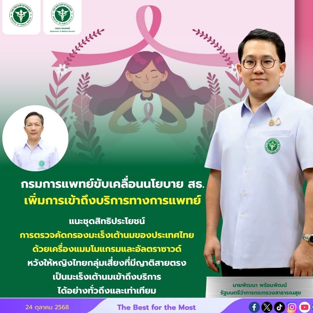 นายแพทย์ณัฐพงศ์ วงศ์วิวัฒน์ อธิบดีกรมการแพทย์ กล่าวว่า มะเร็งเต้านม เป็นสาเหตุการเสียชีวิตอันดับต้น ๆ ของผู้หญิงทั่วโลกรวมถึงในประเทศไทย อย่างไรก็ตาม มะเร็งเต้านมเป็นโรคที่สามารถ “ป้องกันได้และรักษาให้หายได้” หากตรวจพบตั้งแต่ระยะเริ่มต้น การตรวจคัดกรองจึงมีบทบาทสำคัญอย่างยิ่งในการช่วยลดอัตราการป่วยและการเสียชีวิตจากโรคนี้ ด้วยตระหนักถึงความสำคัญดังกล่าว กระทรวงสาธารณสุข จึงได้ให้ความสำคัญต่อการจัดบริการคัดกรองมะเร็งเต้านมอย่างครอบคลุม ภายใต้ “ชุดสิทธิประโยชน์การตรวจคัดกรองมะเร็งเต้านมของประเทศไทย” เพื่อให้ผู้หญิงไทยทุกคนสามารถเข้าถึงบริการได้อย่างทั่วถึงและเท่าเทียม