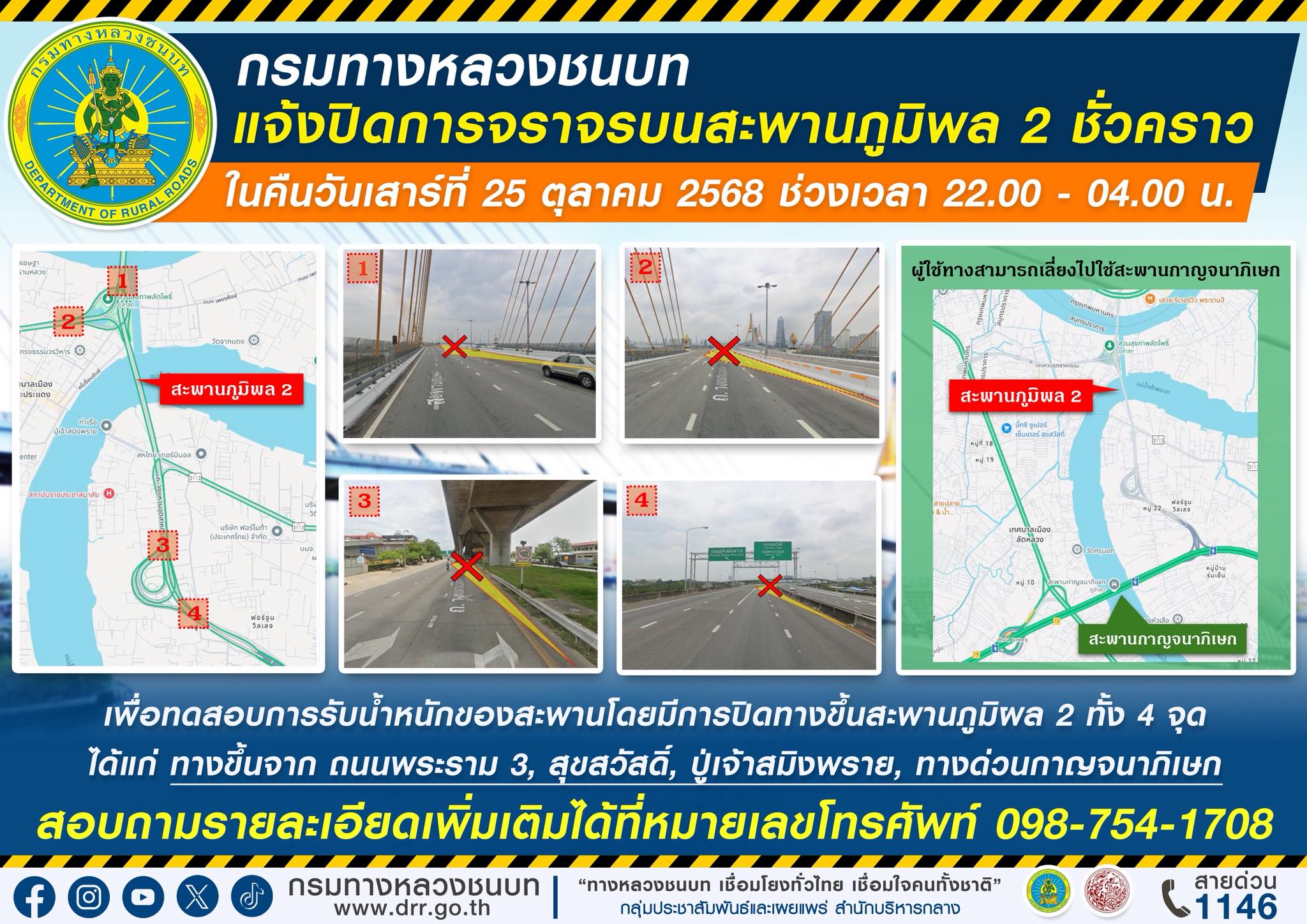 • กรมทางหลวงชนบท แจ้งปิดการจราจรชั่วคราวบนสะพานภูมิพล 2 ในคืนวันที่ 25 ตุลาคม 2568 ช่วงเวลา 22.00 น. ถึง 04.00 น. ของวันถัดไป