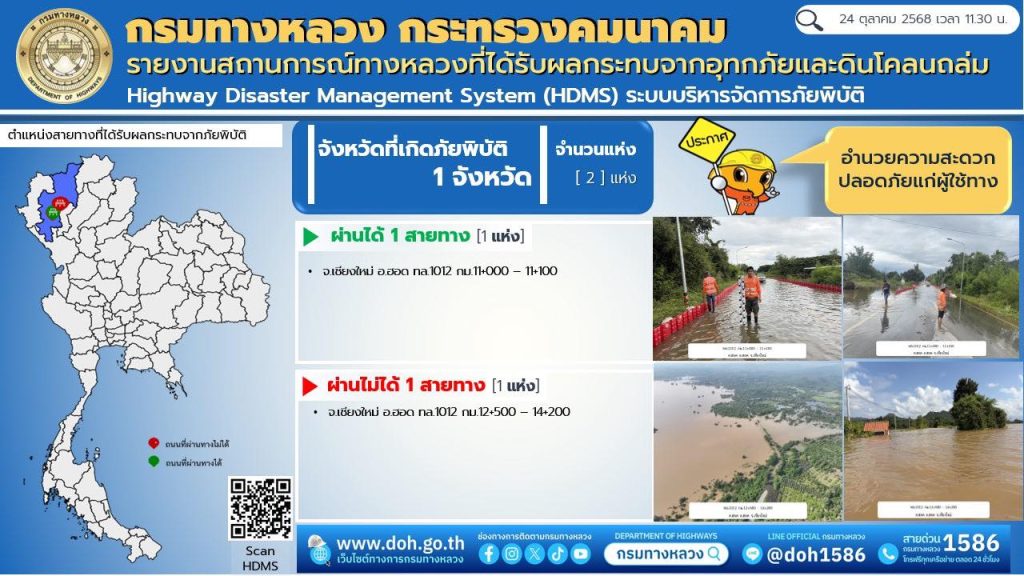 กรมทางหลวง สรุปสถานการณ์ผลกระทบจากอุทกภัย ในพื้นที่จังหวัดเชียงใหม่ ในวันที่ 24 ตุลาคม 2568