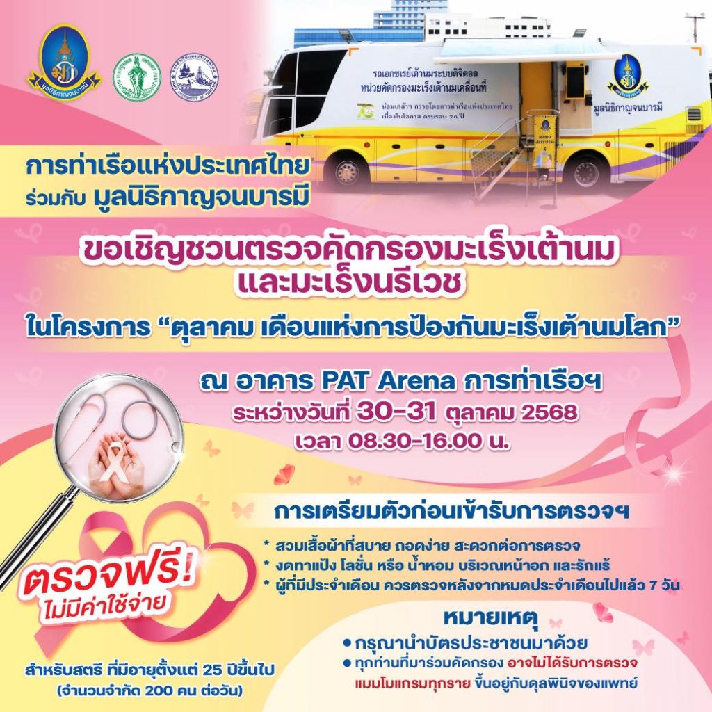 การท่าเรือแห่งประเทศไทย ร่วมกับ มูลนิธิกาญจนบารมี เชิญชวนตรวจคัดกรองมะเร็งเต้านมและมะเร็งนรีเวช ฟรี ระหว่างวันที่ 30 – 31 ตุลาคม 2568 เวลา 08.30 – 16.00 น. ณ อาคาร PAT Arena การท่าเรือฯ สำหรับสตรี ที่มีอายุตั้งแต่ 25 ปีขึ้นไป (จำนวนจำกัด 200 คน ต่อวัน)