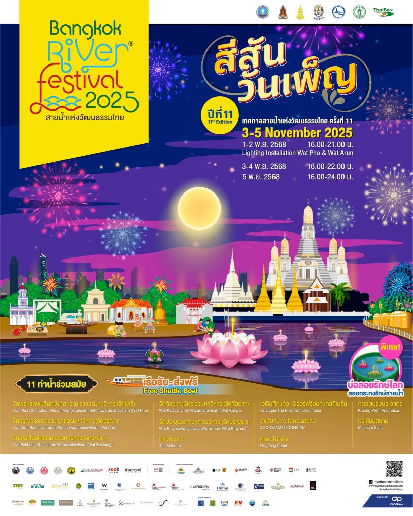 กระทรวงวัฒนธรรม ร่วมกับ ภาคเอกชน จัดงานเทศกาลสายน้ำแห่งวัฒนธรรมไทย ครั้งที่ 11 (Bangkok River Festival 2025) ภายใต้แนวคิด “สีสันวันเพ็ญ” ระหว่างวันที่ 3 – 5 พฤศจิกายน 2568 ณ 11 ท่าน้ำร่วมสมัย