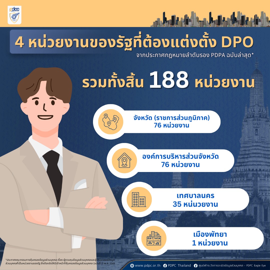 ศูนย์เฝ้าระวังการละเมิดข้อมูลส่วนบุคคล ประกาศ 4 หน่วยงานรัฐต้องแต่งตั้ง DPO ครอบคลุม 188 หน่วยงาน PDPA, ข่าวสารกิจกรรม ศูนย์เฝ้าระวังการละเมิดข้อมูลส่วนบุคคล ประกาศ 4 หน่วยงานรัฐต้องแต่งตั้ง DPO ครอบคลุม 188 หน่วยงาน ศูนย์เฝ้าระวังการละเมิดข้อมูลส่วนบุคคล ประกาศให้หน่วยงานของรัฐ 4 ประเภท ได้แก่ จังหวัด, องค์การบริหารส่วนจังหวัด (อบจ.), เทศบาลนคร และเมืองพัทยา ต้องแต่งตั้งเจ้าหน้าที่คุ้มครองข้อมูลส่วนบุคคล (DPO) เพิ่มอีก 188 หน่วยงาน เพื่อสอดคล้องกับกฎหมาย PDPA ศูนย์เฝ้าระวังการละเมิดข้อมูลส่วนบุคคล ประกาศหน่วยงานของรัฐ 4 ประเภท ต้องแต่งตั้งเจ้าหน้าที่คุ้มครองข้อมูลส่วนบุคคล (Data Protection Officer: DPO) เพิ่มเติม เพื่อให้สอดคล้องกับกฎหมายคุ้มครองข้อมูลส่วนบุคคล พ.ศ. 2562 (PDPA) DPO เป็นตำแหน่งตามมาตรา 41 ของ PDPA ทำหน้าที่ให้คำปรึกษา ตรวจสอบกระบวนการประมวลผลข้อมูลส่วนบุคคล และประสานงานด้านการคุ้มครองข้อมูลสำหรับองค์กรหรือหน่วยงานที่เป็นผู้ควบคุมหรือผู้ประมวลผลข้อมูลประกาศฉบับล่าสุดกำหนดให้หน่วยงานของรัฐ 4 ประเภท จำนวนรวม 188 หน่วยงาน ต้องแต่งตั้ง DPO ได้แก่จังหวัด (ราชการส่วนภูมิภาค) จำนวน 76 หน่วยงานองค์การบริหารส่วนจังหวัด (อบจ.) จำนวน 76 หน่วยงานเทศบาลนคร จำนวน 35 หน่วยงานเมืองพัทยา จำนวน 1 หน่วยงาน ประกาศมีผลบังคับใช้ตั้งแต่วันที่ 9 ธันวาคม 2568 โดยหน่วยงานมีระยะเวลาเตรียมความพร้อม 60 วัน นับจากวันที่ประกาศ (9 ตุลาคม 2568) ประกาศฉบับนี้เป็นการเพิ่มเติม (ฉบับที่ 2) จากประกาศก่อนหน้านี้ที่กำหนดรายชื่อหน่วยงานของรัฐจำนวน 85 หน่วยงานให้จัดตั้ง DPO เพื่อให้การบังคับใช้กฎหมาย PDPA ครอบคลุมและมีประสิทธิภาพมากยิ่งขึ้น ที่มา : Facebook ศูนย์เฝ้าระวังการละเมิดข้อมูลส่วนบุคคล – PDPC Eagle Eye Post Views: 11 FacebookFacebookXTwitterLINELine