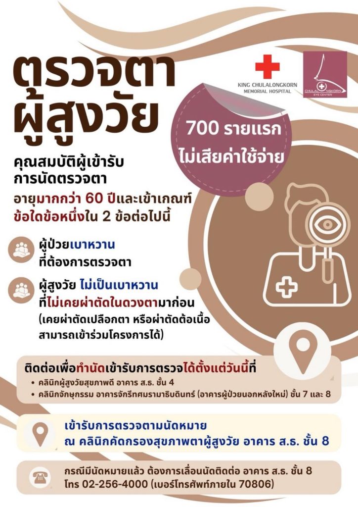 โรงพยาบาลจุฬาลงกรณ์ สภากาชาดไทย เปิดให้บริการตรวจคัดกรองสุขภาพตาผู้สูงวัย ฟรีไม่มีค่าใช้จ่าย