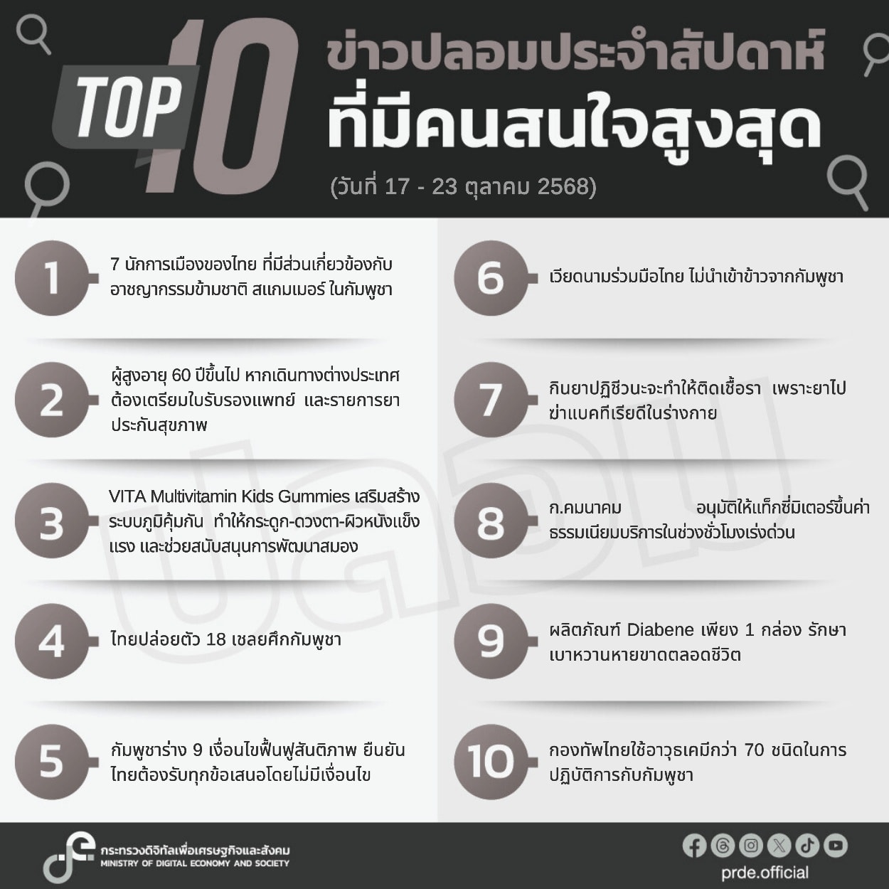 กระทรวงดิจิทัลเพื่อเศรษฐกิจและสังคม ตรวจพบข่าวปลอมรายสัปดาห์ ที่ประชาชนให้ความสนใจสูงสุดอันดับที่ 1 เรื่อง “7 นักการเมืองไทย ที่มีส่วนเกี่ยวข้องกับอาชญากรรมข้ามชาติ สแกมเมอร์ ในกัมพูชา” รองลงมาคือเรื่อง “ผู้สูงอายุ 60 ปีขึ้นไป หากเดินทางต่างประเทศ ต้องเตรียมใบรับรองแพทย์ รายการยา ประกันสุขภาพ” เตือนประชาชน อย่าหลงเชื่อข่าวปลอม อาจทำให้เกิดความเข้าใจผิด สับสน ตื่นตระหนก และวิตกกังวลในสังคม รวมทั้งอาจทำให้สูญเสียทรัพย์สิน และข้อมูลส่วนบุคคล ขอให้เลือกเชื่อ เลือกแชร์ ข้อมูลที่เป็นประโยชน์