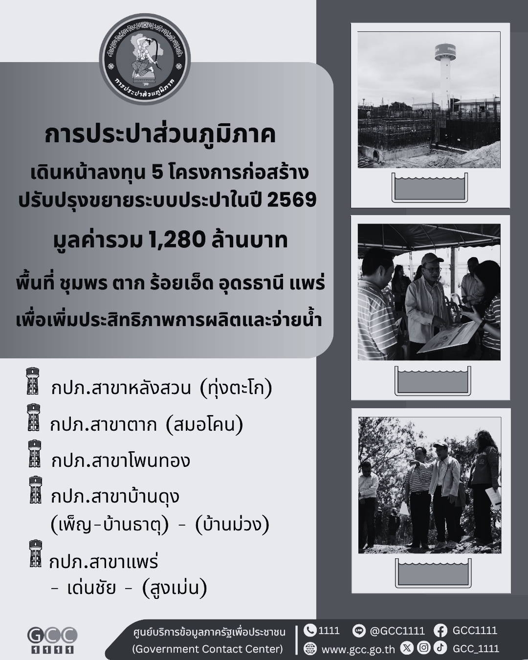 การประปาส่วนภูมิภาค (กปภ.) เดินหน้าลงทุน 5 โครงการก่อสร้างปรับปรุงขยายระบบประปาในปีงบประมาณ 2569 พื้นที่ กปภ.สาขาชุมพร ตาก ร้อยเอ็ด อุดรธานี และแพร่ เพื่อเพิ่มประสิทธิภาพการผลิตและจ่ายน้ำประปาให้เพียงพอต่อความต้องการใช้น้ำที่เพิ่มขึ้น เสริมสร้างความมั่นคงด้านน้ำประปารองรับการขยายตัวของเมืองและเศรษฐกิจ ยกระดับคุณภาพชีวิตประชาชนได้มีน้ำสะอาดใช้อย่างทั่วถึง เท่าเทียม และยั่งยืน