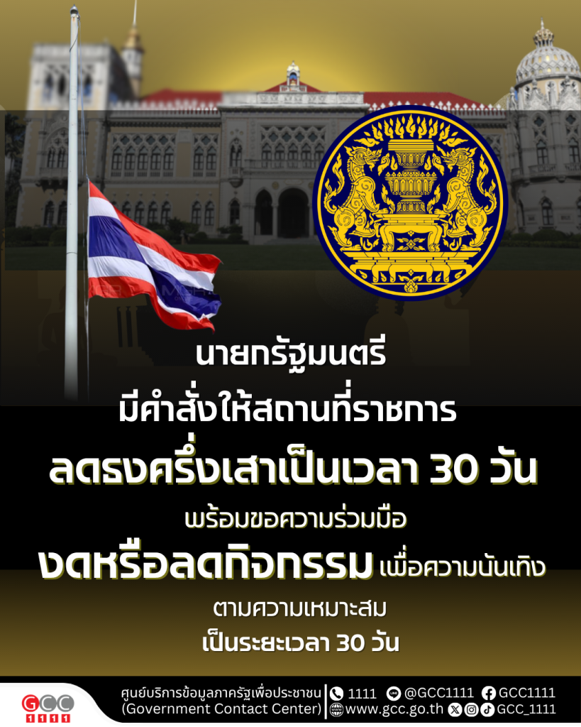 นายกรัฐมนตรี มีคำสั่งสถานที่ราชการลดธงครึ่งเสาเป็นเวลา 30 วัน ขอความร่วมมืองดคอนเสิร์ต งานรื่นเริง