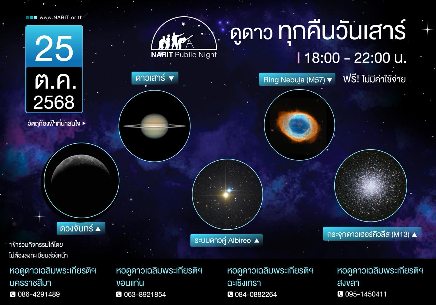 สดร. ชวนร่วมกิจกรรม NARIT Public Night วันที่ 25 ตุลาคม 2568 ข่าวสารกิจกรรม สดร. ชวนร่วมกิจกรรม NARIT Public Night วันที่ 25 ตุลาคม 2568 สถาบันวิจัยดาราศาสตร์แห่งชาติ ชวนร่วมกิจกรรม NARIT Public Night ฟรี วันที่ 25 ตุลาคม 2568 เวลา 18.00 – 22.00 น. ณ หอดูดาวภูมิภาคสำหรับประชาชน ทุกคืนวันเสาร์ เรามีนัดกันกับกิจกรรม NARIT Public Night ฟรีไม่มีค่าใช้จ่าย ไม่ว่าจะอยู่หนใด ใกล้ที่ไหนไปที่นั่นหอดูดาวเฉลิมพระเกียรติ 7 รอบพระชนมพรรษา นครราชสีมาhttps://goo.gl/maps/4icKMqPfH7RErK1b6หอดูดาวเฉลิมพระเกียรติ 7 รอบ พระชนมพรรษา ฉะเชิงเทราhttps://goo.gl/maps/9JFJU6GYXhB2TdaYAหอดูดาวเฉลิมพระเกียรติ 7 รอบ พระชนมพรรษา สงขลาhttps://goo.gl/maps/oZX2Zc4cxd42tEb57หอดูดาวเฉลิมพระเกียรติ 7 รอบ พระชนมพรรษา ขอนแก่นhttps://maps.app.goo.gl/fBxypukvmxxA8zE78 ที่มา : Facebook : สถาบันวิจัยดาราศาสตร์แห่งชาติ Post Views: 8 FacebookFacebookXTwitterLINELine