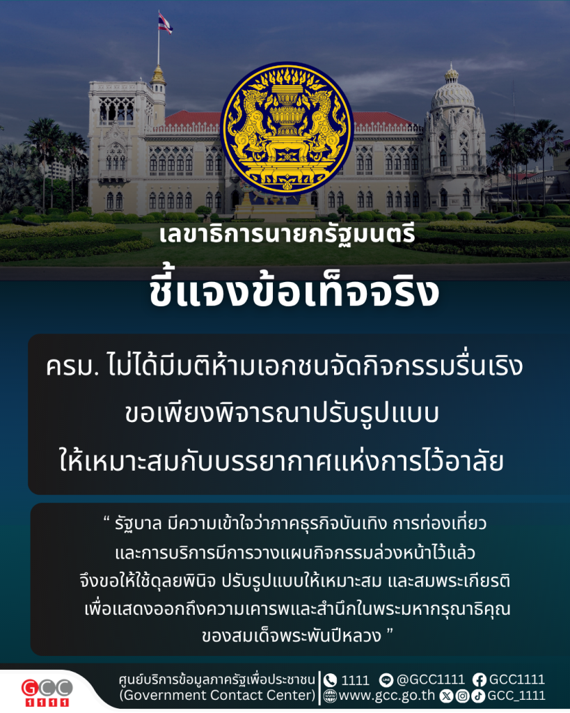 เลขาธิการนายกฯ ชี้แจง ครม. ไม่ได้มีมติห้ามเอกชนจัดกิจกรรมรื่นเริง ขอเพียงให้ใช้ดุลยพินิจปรับรูปแบบให้เหมาะสม และสมพระเกียรติ เพื่อแสดงออกถึงความเคารพและสำนึกในพระมหากรุณาธิคุณของสมเด็จพระพันปีหลวง