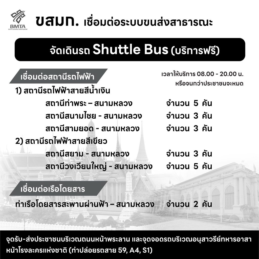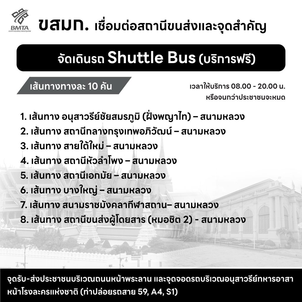 - จุดรับ-ส่งประชาชน บริเวณถนนหน้าพระลาน และจุดจอดรถบริเวณอนุสาวรีย์ทหารอาสา หน้าโรงละครแห่งชาติ (ท่าปล่อยรถสาย 59, A4, S1)