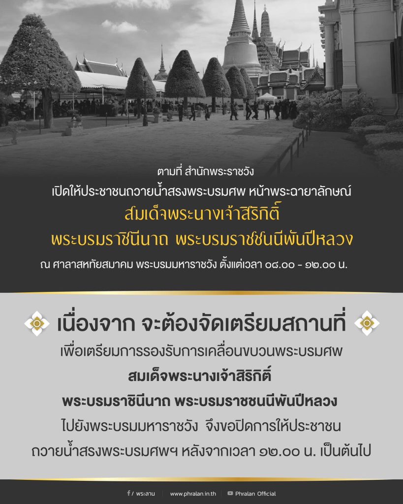 สำนักพระราชวัง เปิดให้ประชาชนถวายน้ำสรงพระบรมศพสมเด็จพระบรมราชชนนีพันปีหลวง ณ ศาลาสหทัยสมาคม ในพระบรมมหาราชวัง เฉพาะวันนี้ (26 ตุลาคม 2568) 08.00 – 12.00 น. เนื่องจากต้องปรับสถานที่เพื่อพระราชพิธี เนื่องจาก จะต้องจัดเตรียมสถานที่ เพื่อเตรียมการรองรับการเคลื่อนขบวนพระบรมศพสมเด็จพระนางเจ้าสิริกิติ์ พระบรมราชินีนาถ พระบรมราชชนนีพันปีหลวง ไปยังพระบรมมหาราชวัง กรณีมาถึงหลังเวลา 12.00 น. สามารถนั่งชมภาพ ผ่านทาง จอที่จัดเตรียมไว้จำนวนมาก ที่เต้นท์ ณ ท้องสนามหลวง มีสถานที่รองรับ มีโรงครัวพระราชทาน และมีจอ LED ให้รับชมถ่ายทอดสด มีบริการรถรับส่งประชาชน ระหว่าง สนามหลวง และพระบรมมหาราชวัง และขอความร่วมมือแต่งกายด้วยชุดสุภาพไว้ทุกข์ งดเสื้อคอกลม ส่วนสุภาพสตรี ขอความร่วมมือนุ่งกระโปรงเท่านั้น งดนุ่งกางเกง ทั้งนี้ กทม. ได้จัดเตรียมบริการผ้านุ่ง ณ จุดคัดกรองที่อุโมงค์ และส่งคืนได้ที่ประตูวิเศษไชยศรี เพียงถ่ายบัตร ปชช. เป็นหลักฐาน