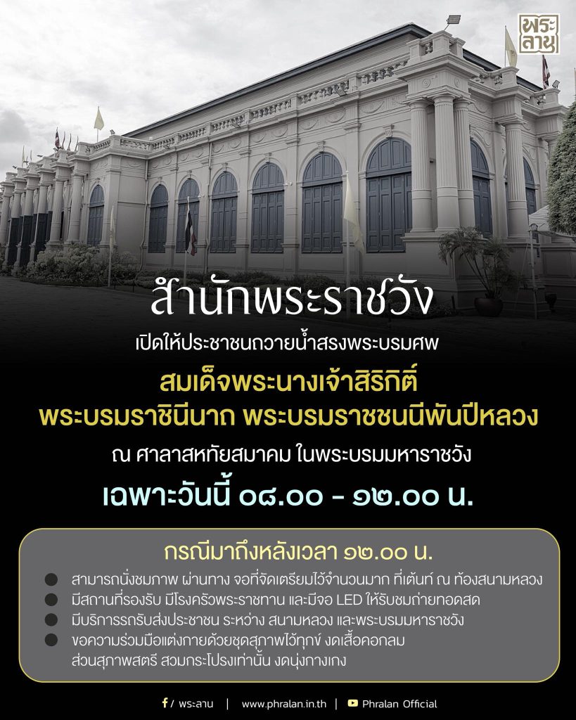 วันนี้ (26 ตุลาคม 2568) ที่ศาลาสหทัยสมาคม ในพระบรมมหาราชวัง ตามที่ สำนักพระราชวัง เปิดให้ประชาชน เข้าถวายน้ำสรงพระบรมศพสมเด็จพระนางเจ้าสิริกิติ์ พระบรมราชินีนาถ พระบรมราชชนนีพันปีหลวง น้อมเกล้าน้อมกระหม่อม ส่งเสด็จสู่สวรรคาลัย เบื้องหน้าพระฉายาลักษณ์ ซึ่งประดิษฐาน ณ ศาลาสหทัยสมาคมในพระบรมมหาราชวัง ในวันอาทิตย์ ที่ 26 ตุลาคม พุทธศักราช 2568 ตั้งแต่เวลา 08.30 – 12.00 น.