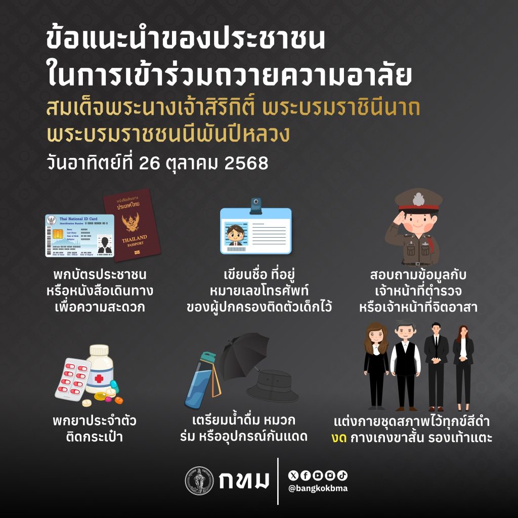 กทม. แนะนำประชาชนในการเข้าร่วมถวายความอาลัย สมเด็จพระนางเจ้าสิริกิติ์ ฯ วันที่ 26 ตุลาคม 2568 ข่าวสารกิจกรรม, สมเด็จพระบรมราชชนนีพันปีหลวง กทม. แนะนำประชาชนในการเข้าร่วมถวายความอาลัย สมเด็จพระนางเจ้าสิริกิติ์ ฯ วันที่ 26 ตุลาคม 2568 กรุงเทพมหานคร แนะนำประชาชนในการเข้าร่วมถวายความอาลัย สมเด็จพระนางเจ้าสิริกิติ์ พระบรมราชินีนาถ พระบรมราชชนนีพันปีหลวง วันอาทิตย์ที่ 26 ตุลาคม 2568 แนะนำขั้นตอนปฏิบัติ ดังนี้พกบัตรประชาชน หรือหนังสือเดินทางเพื่อความสะดวก เขียนชื่อ ที่อยู่ หมายเลขโทรศัพท์ ของผู้ปกครองติดตัวเด็กไว้สอบถามข้อมูลกับเจ้าหน้าที่ตำรวจ หรือเจ้าหน้าที่จิตอาสาพกยาประจำตัวติดกระเป๋าเตรียมน้ำดื่ม หมวก ร่ม หรืออุปกรณ์กันแดดแต่งกายชุดสภาพไว้ทุกข์สีดำ งดกางเกงขาสั้น รองเท้าแตะหมายเหตุ : ผู้เข้าร่วมพิธีฯ ควรเข้าพื้นที่ก่อนถึงเวลาประมาณ 2 ชั่วโมง เนื่องจากมีผู้มาร่วมพิธีฯ จำนวนมาก ที่มา : Facebook กรุงเทพมหานคร Post Views: 17 FacebookFacebookXTwitterLINELine