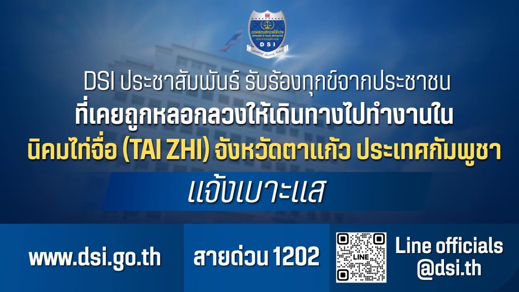 DSI ประชาสัมพันธ์ รับร้องทุกข์จากประชาชนที่เคยถูกหลอกลวงให้เดินทางไปทำงานในนิคมไท่จื่อ (TAI ZHI) จังหวัดตาแก้ว ประเทศกัมพูชา