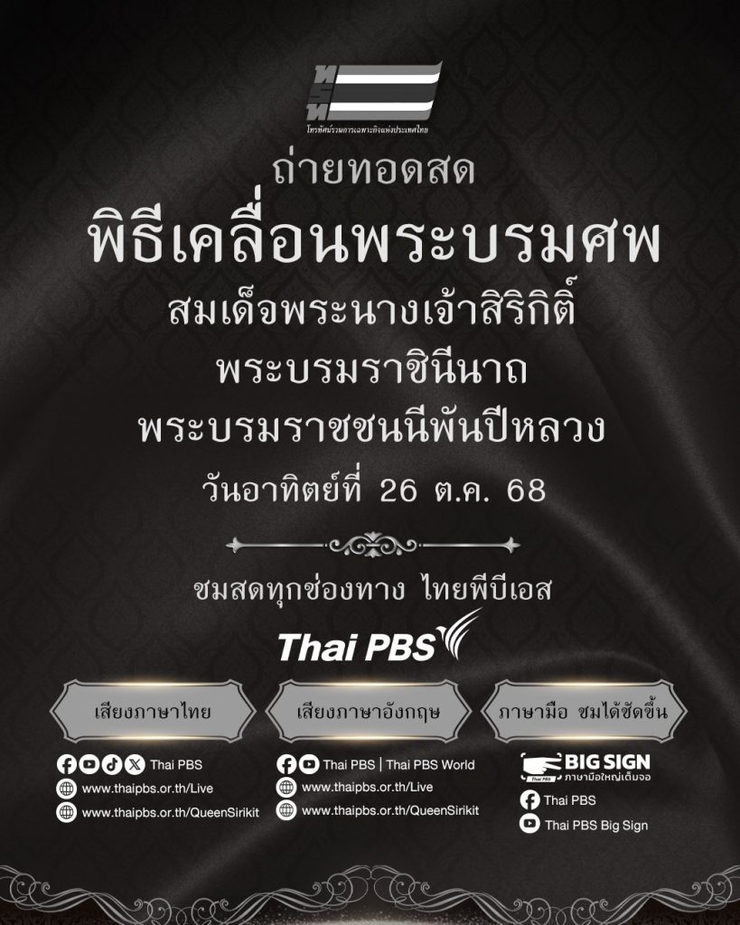 หมายกำหนดการพิธีเคลื่อนพระบรมศพ สมเด็จพระนางเจ้าสิริกิติ์ พระบรมราชินีนาถ พระบรมราชชนนีพันปีหลวง วันอาทิตย์ที่ 26 ต.ค. 68