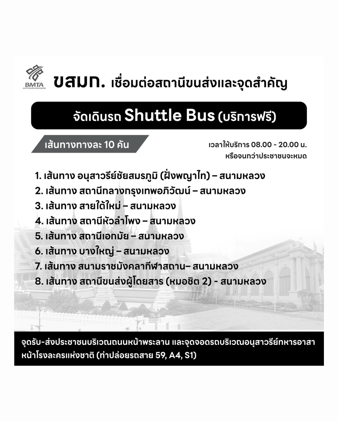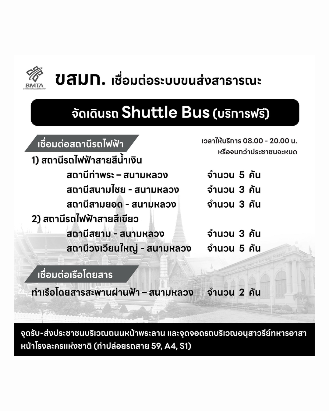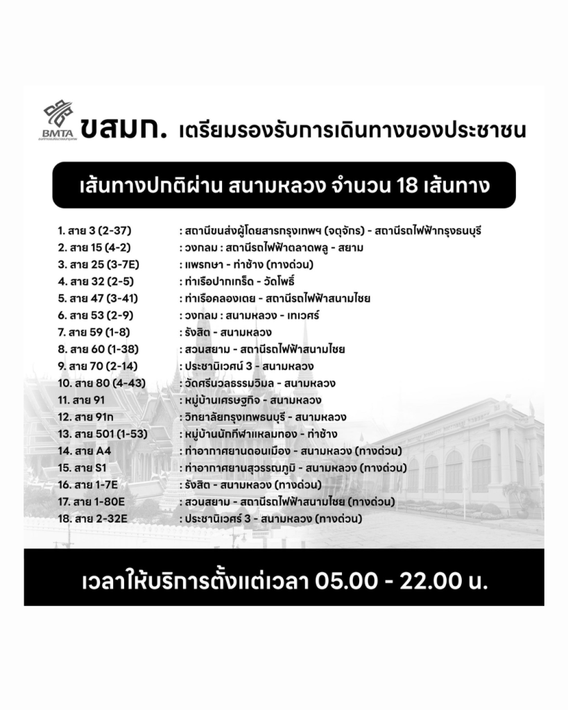 จุดให้บริการตั้งอยู่บริเวณถนนหน้าพระลาน และจุดจอดรถบริเวณอนุสาวรีย์ทหารอาสา หน้าโรงละครแห่งชาติ ให้บริการตั้งแต่เวลา 08.00 – 20.00 น. หรือจนกว่าประชาชนจะออกจากพื้นที่จนหมดสอบถามข้อมูลเพิ่มเติมได้ที่ BMTA Contact Center โทร. 1348 เฟซบุ๊กแฟนเพจ “ขสมก. พร้อมบวก และ www.bmta.co.th