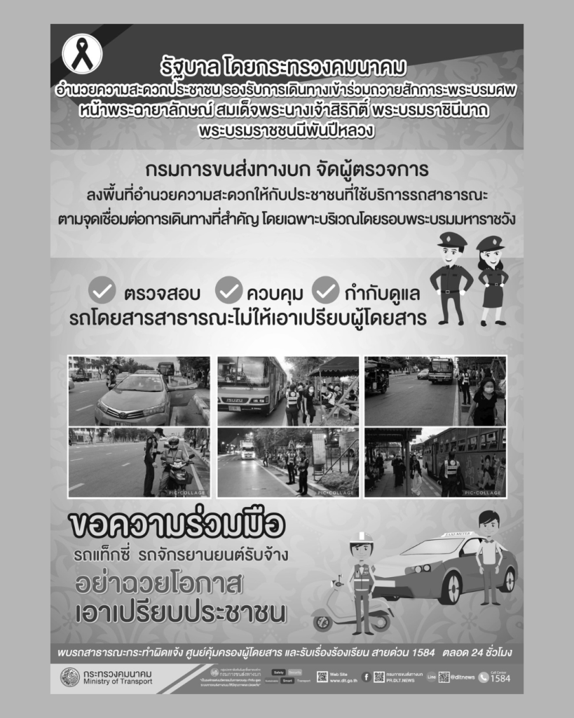 รัฐบาล โดยกระทรวงคมนาคม จัดมาตรการอำนวยความสะดวกประชาชนในการเดินทางเข้าร่วมถวายสักการะพระบรมศพหน้าพระฉายาลักษณ์ สมเด็จพระนางเจ้าสิริกิติ์ พระบรมราชินีนาถ พระบรมราชชนนีพันปีหลวง
