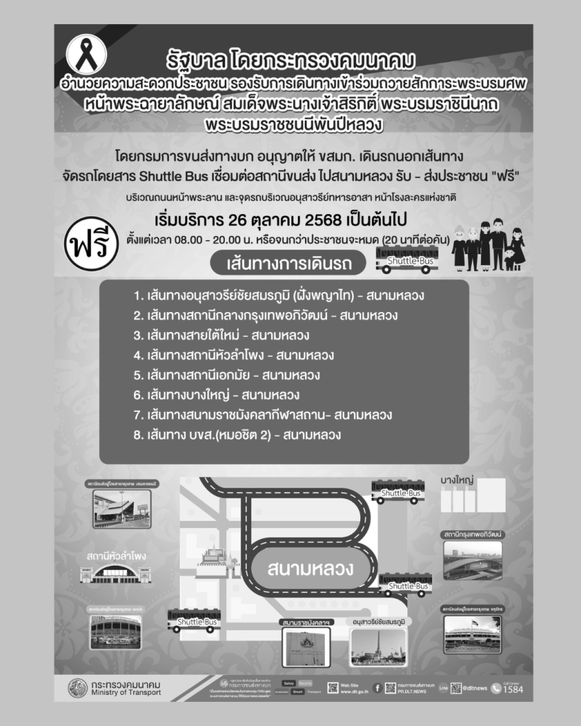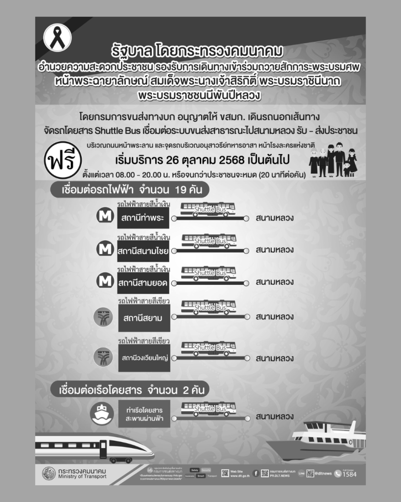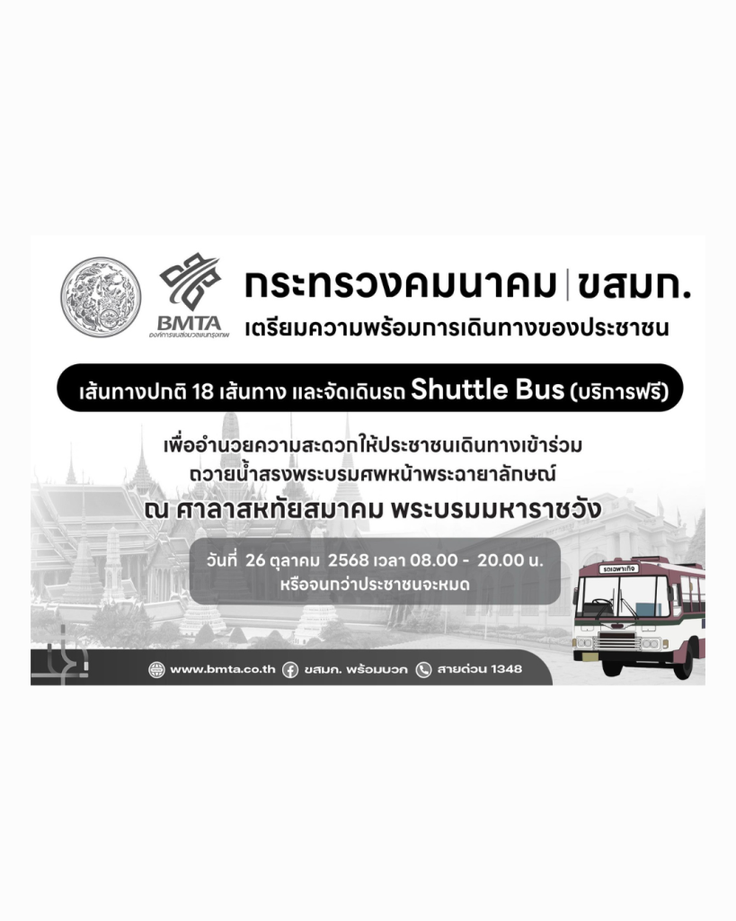 องค์การขนส่งมวลชนกรุงเทพ พร้อมอำนวยความสะดวกประชาชนในการเดินทางเข้าร่วมถวายน้ำสรงพระบรมศพ สมเด็จพระพันปีหลวง เบื้องหน้าพระบรมฉายาลักษณ์ วันที่ 26 ตุลาคม 2568 ณ ศาลาสหทัยสมาคม พระบรมมหาราชวัง