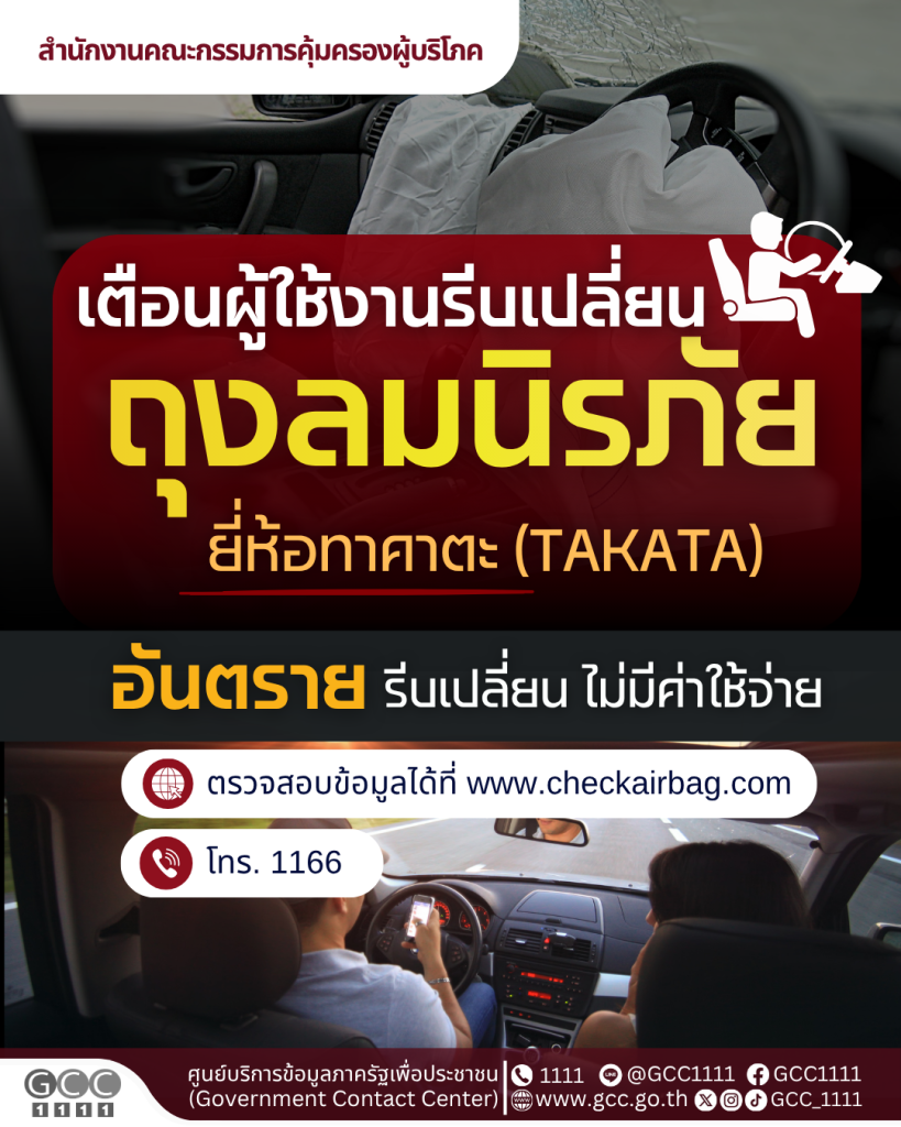 สำนักงานคณะกรรมการคุ้มครองผู้บริโภค เตือนภัยผู้บริโภคทุกคนที่ยังใช้รถยนต์ที่ติดตั้งถุงลมนิรภัยยี่ห้อ TAKATA ให้รีบเปลี่ยน เพราะส่งผลให้เกิดอุบัติเหตุจนได้รับบาดเจ็บสาหัส