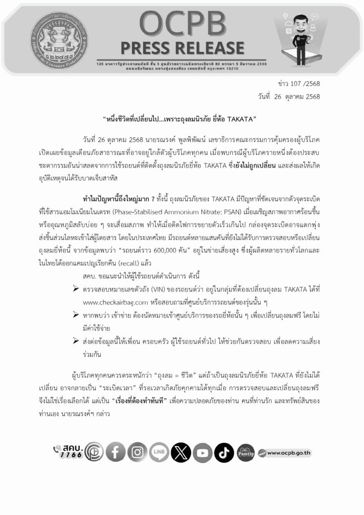 วันที่ 26 ตุลาคม 2568 นายรณรงค์ พูลพิพัฒน์ เลขาธิการคณะกรรมการคุ้มครองผู้บริโภค เปิดเผยข้อมูลเตือนภัยสาธารณะที่อาจอยู่ใกล้ตัวผู้บริโภคทุกคน เมื่อพบกรณีผู้บริโภครายหนึ่งต้องประสบ ชะตากรรมอันน่าสลดจากการใช้รถยนต์ที่ติดตั้งถุงลมนิรภัยยี่ห้อ TAKATA ซึ่งยังไม่ถูกเปลี่ยน และส่งผลให้เกิด อุบัติเหตุจนได้รับบาดเจ็บสาหัส