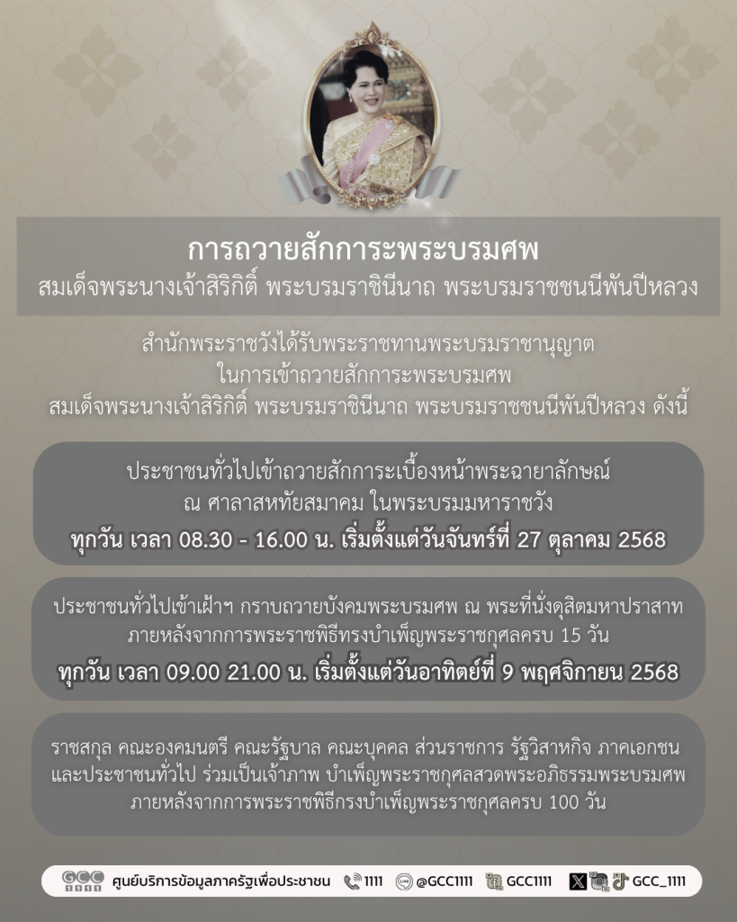 สำนักพระราชวัง ประกาศการถวายสักการะพระบรมศพ พระนางเจ้าสิริกิติ์ฯ เริ่มตั้งแต่วันที่ 27 ต.ค 68