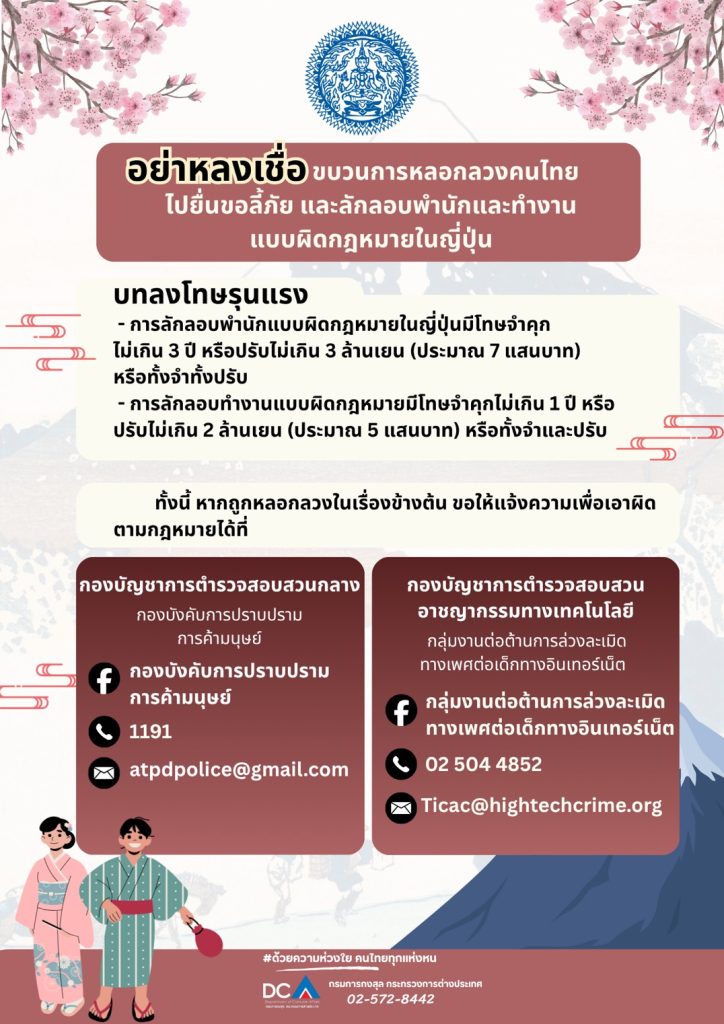 กรมการกงสุล เตือนอย่าหลงเชื่อ ขบวนการหลอกลวงคนไทยไปยื่นขอลี้ภัย หรือลักลอบพำนักและทำงานผิดกฎหมายในญี่ปุ่น