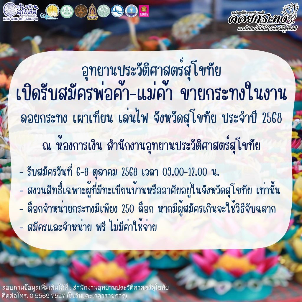 อุทยานประวัติศาสตร์สุโขทัย เปิดรับสมัครพ่อค้า-แม่ค้า ขายกระทงในงานลอยกระทง เผาเทียน เล่นไฟ จังหวัดสุโขทัย ประจำปี 2568