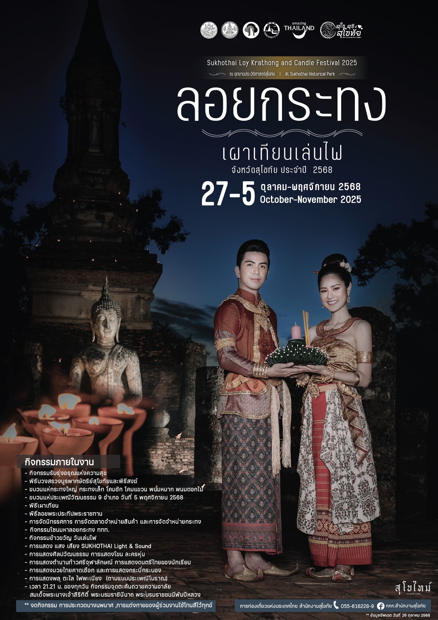 ทั้งนี้ จังหวัดสุโขทัยขอเชิญชวนประชาชนและนักท่องเที่ยวเข้าร่วมชมความงดงามของขบวนแห่งานประเพณีลอยกระทง เผาเทียน เล่นไฟ จังหวัดสุโขทัย ประจำปี 2568 ณ อุทยานประวัติศาสตร์สุโขทัย โดยวันจันทร์ที่ 27 ตุลาคม 2568 เป็นวันเปิดงาน และวันพุธที่ 5 พฤศจิกายน 2568 เป็นวันลอยกระทง