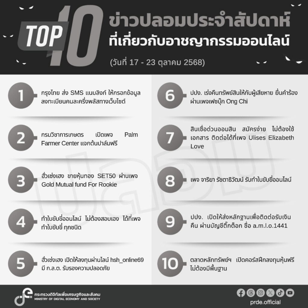 กระทรวงดิจิทัลเพื่อเศรษฐกิจและสังคม ตรวจพบข่าวปลอมรายสัปดาห์ที่เกี่ยวข้องกับอาชญากรรมออนไลน์ ซึ่งประชาชนให้ความสนใจสูงสุดอันดับที่ 1 เรื่อง “กรุงไทย ส่ง SMS แนบลิงก์ ให้กรอกข้อมูลลงทะเบียนคนละครึ่งพลัสทางเว็บไซต์” รองลงมาคือเรื่อง “กรมวิชาการเกษตร เปิดเพจ Palm Farmer Center แจกต้นปาล์มฟรี” โดยขอเตือนประชาชน อย่าหลงเชื่อข่าวปลอม หวั่นสร้างความเสียหายทั้งข้อมูลส่วนบุคคล ทรัพย์สิน และอาจส่งผลกระทบต่อประชาชนในสังคมเป็นวงกว้าง ขอให้เลือกเชื่อ – แชร์ ข้อมูลที่เป็นประโยชน์