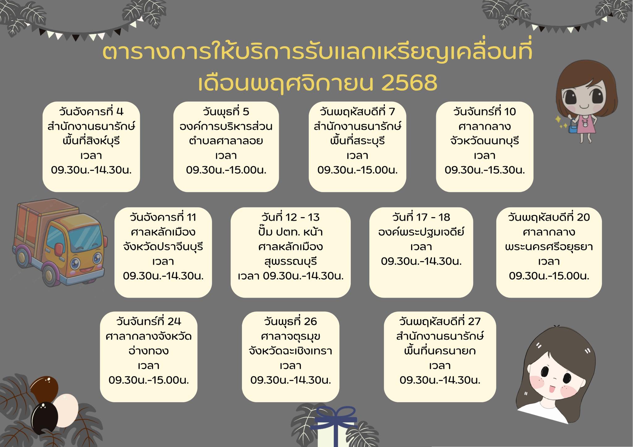 กรมธนารักษ์ จัดรถรับแลกคืนเหรียญกษาปณ์เคลื่อนที่ออกให้บริการ เดือนพฤศจิกายน 2568