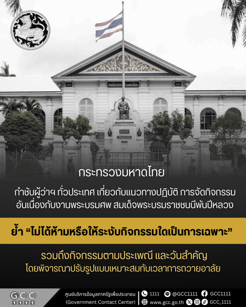 ปลัดกระทรวงมหาดไทย กำชับผู้ว่าฯ ทั่วประเทศ เกี่ยวกับการจัดกิจกรรมอันเนื่องกับงานพระบรมศพ สมเด็จพระบรมราชชนนีพันปีหลวง ตามมติ ครม. 25 ต.ค. 68 ย้ำ “ไม่ได้ห้ามหรือให้ระงับกิจกรรมใดเป็นการเฉพาะ” รวมถึงกิจกรรมตามประเพณี และวันสำคัญด้วย โดยพิจารณาตามความเหมาะสมซึ่งอาจปรับรูปแบบให้สอดคล้องกับช่วงเวลาการถวายอาลัย