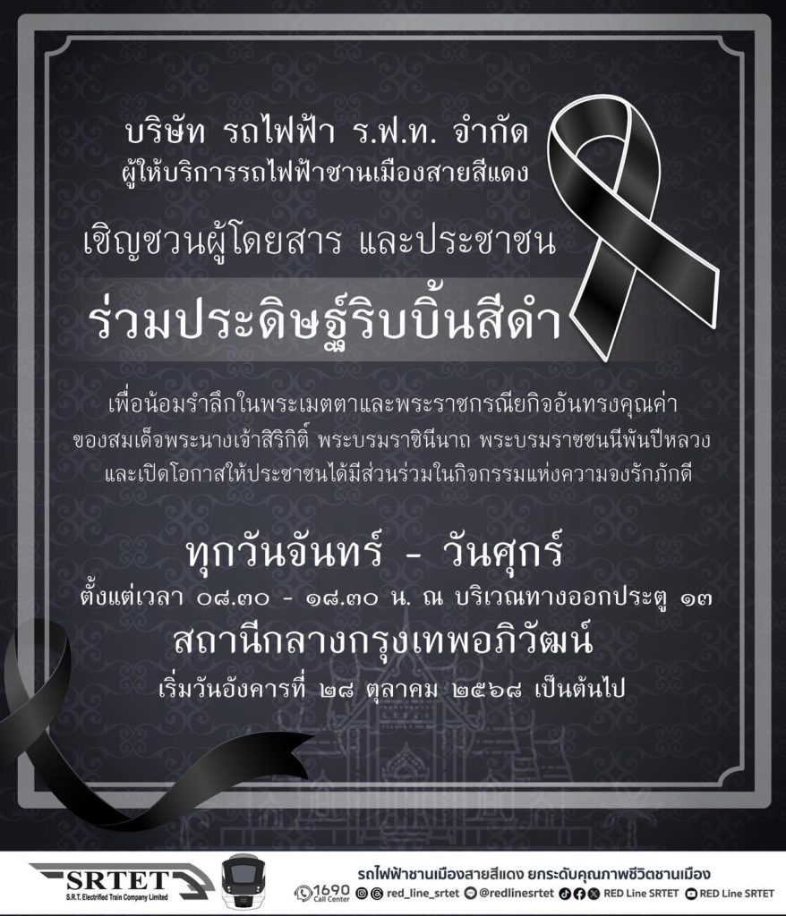 รถไฟฟ้าชานเมืองสายสีแดง เชิญชวนร่วมประดิษฐ์ริบบิ้นสีดำเพื่อน้อมรำลึก ฯ พระบรมราชชนนีพันปีหลวง ข่าวสารกิจกรรม, สมเด็จพระบรมราชชนนีพันปีหลวง รถไฟฟ้าชานเมืองสายสีแดง เชิญชวนร่วมประดิษฐ์ริบบิ้นสีดำเพื่อน้อมรำลึก ฯ พระบรมราชชนนีพันปีหลวง บริษัท รถไฟฟ้า ร.ฟ.ท. จำกัด เชิญชวนผู้โดยสาร และประชาชนร่วมประดิษฐ์ริบบิ้นสีดำ เพื่อน้อมรำลึกในพระเมตตาและพระราชกรณียกิจอันทรงคุณค่าของสมเด็จพระนางเจ้าสิริกิติ์ พระบรมราชินีนาถ พระบรมราชชนนีพันปีหลวง เริ่มวันอังคารที่ 28 ตุลาคม 2568 เป็นต้นไป ทุกวันจันทร์ – วันศุกร์ เวลา 08.30 – 18.30 น. ณ บริเวณทางออกประตู 13 สถานีกลางกรุงเทพอภิวัฒน์ ที่มา : Facebook RED Line SRTET Post Views: 15 FacebookFacebookXTwitterLINELine