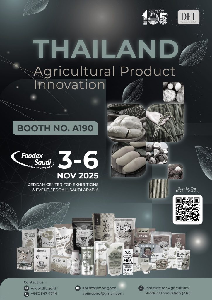 ภายใต้บูธของกรมฯ ในธีม “Thailand Agricultural Product Innovation” ในงาน Foodex Saudi 2025 เป็นครั้งแรก ณ ศูนย์จัดแสดงสินค้า Jeddah Center for Exhibitions & Events, Booth No. A190 เมืองเจดดาห์ ประเทศซาอุดีอาระเบีย ระหว่างวันที่ 3-6 พฤศจิกายน 2568