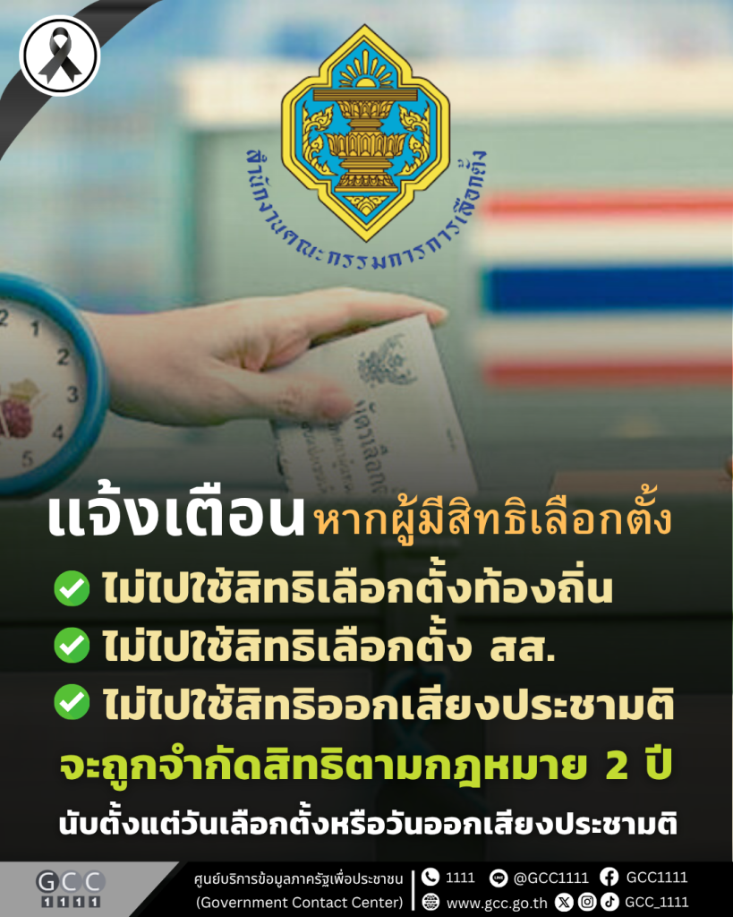 สำนักงานคณะกรรมการการเลือกตั้ง แจ้งเตือนหากผู้มีสิทธิไม่ไปใช้สิทธิเลือกตั้งสมาชิกสภาท้องถิ่นหรือผู้บริหารท้องถิ่น (อบต. เทศบาล หรือ อบจ.) ไม่ไปใช้สิทธิเลือกตั้งสมาชิกสภาผู้แทนราษฎร (สส.) หรือไม่ไปใช้สิทธิออกเสียงประชามติ และไม่ได้แจ้งเหตุที่ไม่อาจไปใช้สิทธิ หรือได้แจ้งแล้วแต่เหตุนั้นไม่ใช่เหตุอันสมควร จะถูกจำกัดสิทธิตามกฎหมายเหมือนกันเป็นเวลา 2 ปี นับตั้งแต่วันเลือกตั้งหรือวันออกเสียงประชามติ