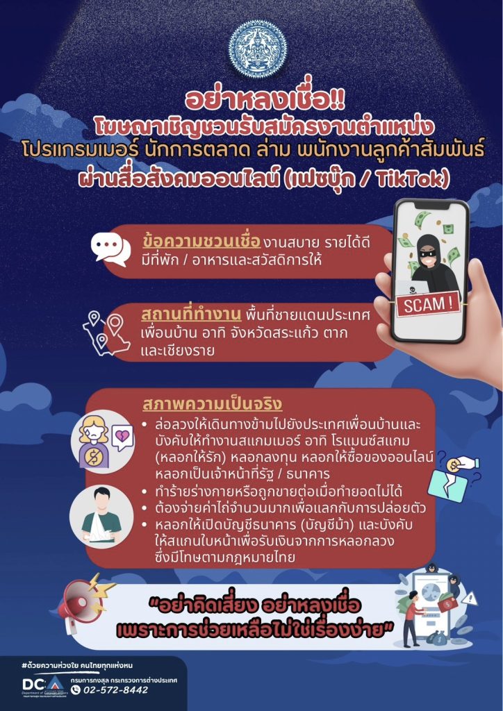 กรมการกงสุล แจ้งเตือนอย่าหลงเชื่อโฆษณาเชิญชวนรับสมัครงาน ฯ ผ่านสื่อสังคมออนไลน์