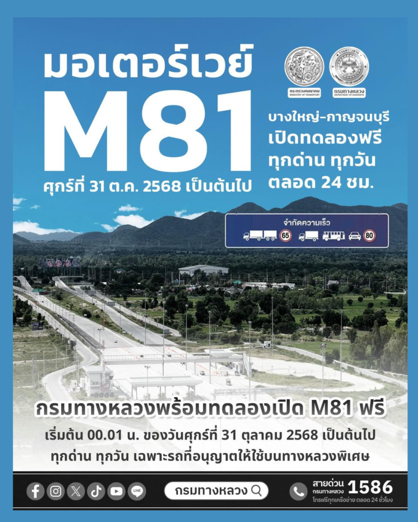 กรมทางหลวง เปิดทดลองให้บริการทางหลวงพิเศษระหว่างเมือง สายบางใหญ่ – กาญจนบุรี (M81) ตลอดสายทาง ทุกวัน ตลอด 24 ชั่วโมง เริ่มวันที่ 31 ตุลาคม 2568 ตั้งแต่ เวลา 00.01 น. เป็นต้นไป โดยไม่เก็บค่าธรรมเนียมผ่านทาง