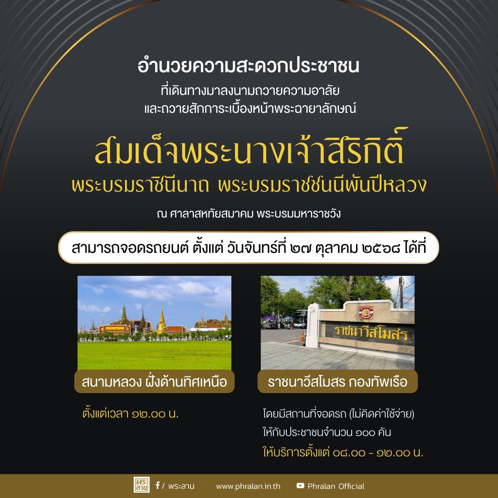 กรมประชาสัมพันธ์ แนะนำพื้นที่จอดรถยนต์ผู้มาลงนามถวายความอาลัยและถวายสักการะเบื้องหน้าพระฉายาลักษณ์ ข่าวสารกิจกรรม, สมเด็จพระบรมราชชนนีพันปีหลวง กรมประชาสัมพันธ์ แนะนำพื้นที่จอดรถยนต์ผู้มาลงนามถวายความอาลัยและถวายสักการะเบื้องหน้าพระฉายาลักษณ์ อำนวยความสะดวกประชาชนที่เดินทางมาลงนามถวายความอาลัย และถวายสักการะเบื้องหน้าพระฉายาลักษณ์ สมเด็จพระนางเจ้าสิริกิติ์ พระบรมราชินีนาถ พระบรมราชชนนีพันปีหลวง ณ ศาลาสหทัยสมาคม พระบรมมหาราชวังสามารถจอดรถยนต์ ตั้งแต่วันจันทร์ที่ 27 ตุลาคม 2568 ได้ที่บริเวณสนามหลวง ฝั่งด้านทิศเหนือ ตั้งแต่เวลา 12.00 น.ราชนาวีสโมสร กองทัพเรือ มีสถานที่จอดรถ (ไม่คิดค่าใช้จ่าย) ให้กับประชาชนจำนวน 100 คัน ให้บริการตั้งแต่ 08.00-12.00 น. ที่มา : Facebook พระลาน Post Views: 33 FacebookFacebookXTwitterLINELine