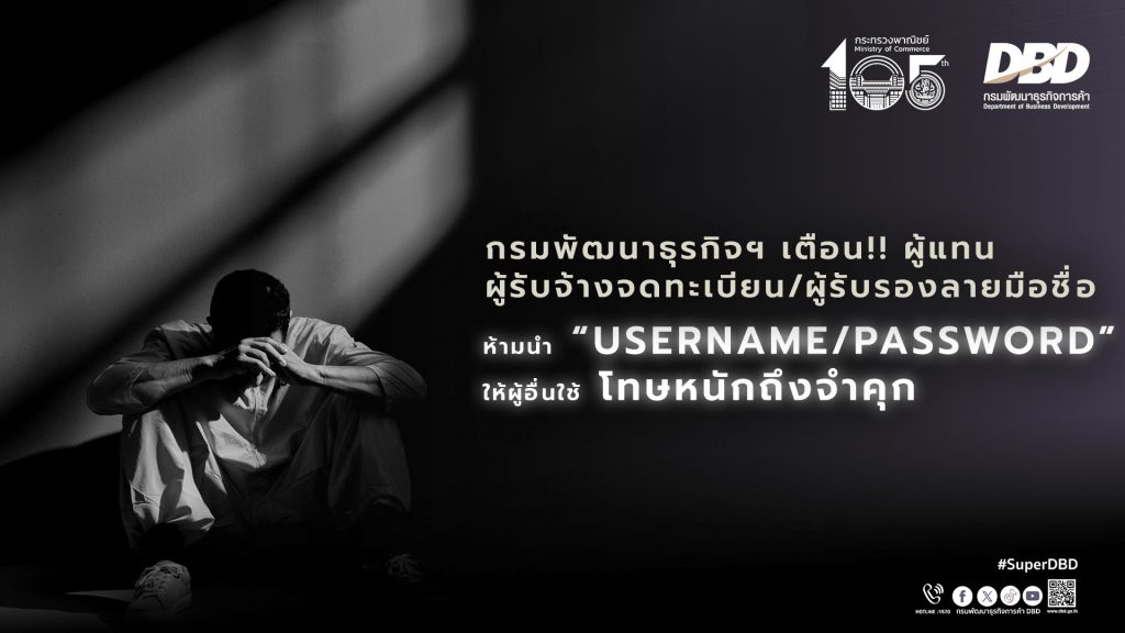 กรมพัฒนาธุรกิจการค้า เตือนผู้ใช้งานระบบ DBD Biz Regist ห้ามให้ผู้อื่นใช้ Username & Password เสี่ยงโทษจำคุก