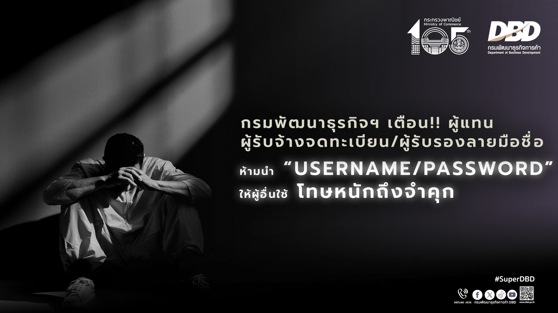 กรมพัฒนาธุรกิจการค้า เตือนประชาชน ผู้ประกอบการ ผู้แทน และผู้รับจ้างจดทะเบียน รวมถึงผู้รับรองลายมือชื่อที่ใช้งานระบบจดทะเบียนนิติบุคคลดิจิทัล (DBD Biz Regist) ห้ามมอบหรือเปิดเผยชื่อผู้ใช้และรหัสผ่าน (Username & Password) ให้บุคคลอื่นใช้ เนื่องจากการกระทำดังกล่าวถือเป็นการละเมิดกฎหมาย หากเกิดความเสียหาย เจ้าของบัญชีต้องรับผิดชอบสูงสุดถึงขั้นจำคุก